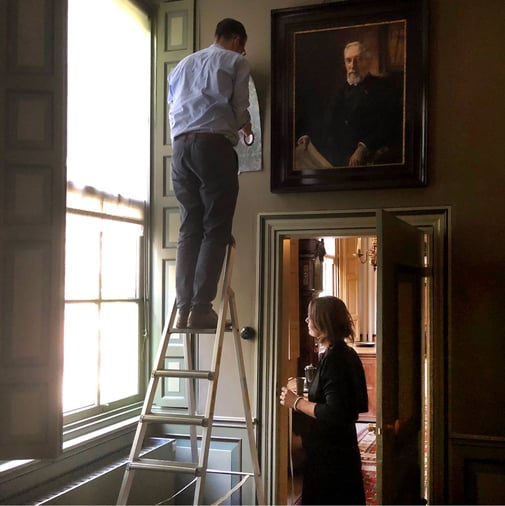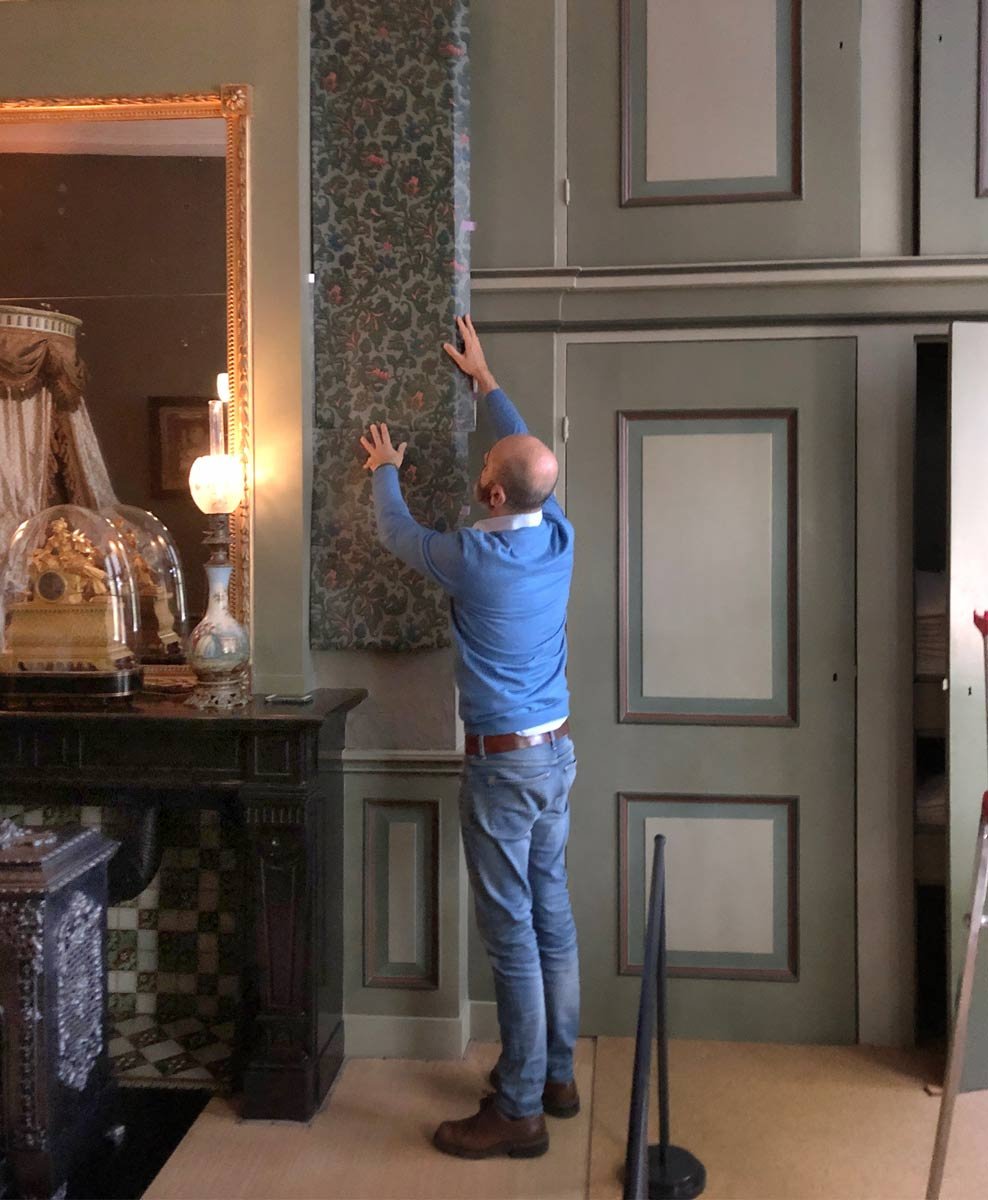 Conservator Wyke Sybesma van museum 'Huis van Gijn' bekijkt samen met Snijder&CO welke behangproef het mooiste effect geeft in de 'Groene Slaapkamer'.