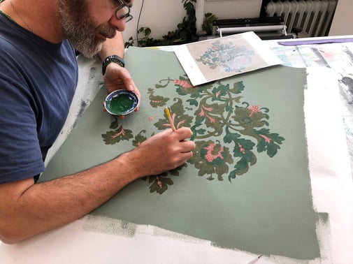 Het reconstrueren van blokdruk behang in de oorspronkelijke techniek is nog steeds mogelijk maar is zeer kostbaar. Zo zijn er in Engeland een paar bedrijven nog gespecialiseerd in deze ambacht. Voor de reconstructie heeft het museum gekozen voor een digitale reconstructie maar die bleek in eerste instantie te 'vlak' en miste het rijke gevoel van het 19e eeuwse behang. Ons is gevraagd of wij een alternatieve aanpak konden bedenken voor de reconstructie. Wij hebben gekozen om het patroon handmatig in 'druklagen' na te schilderen, een soort 'blokdruk' imitatie.