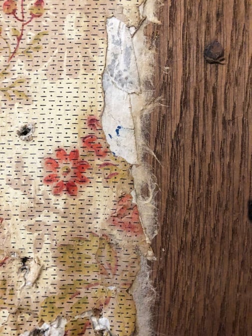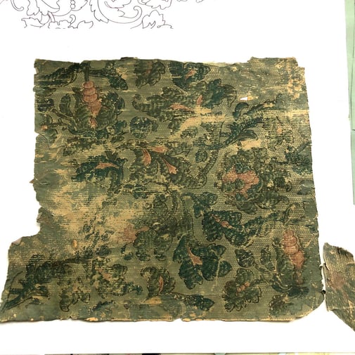 Originele behangstukken, bijna vergaan na ruim 100 jaar. Het stuk is afkomstig van de schoorsteenmantel en was zwaarbeschadigd door warmte en vroegere lekkage vanuit de schoorsteen.