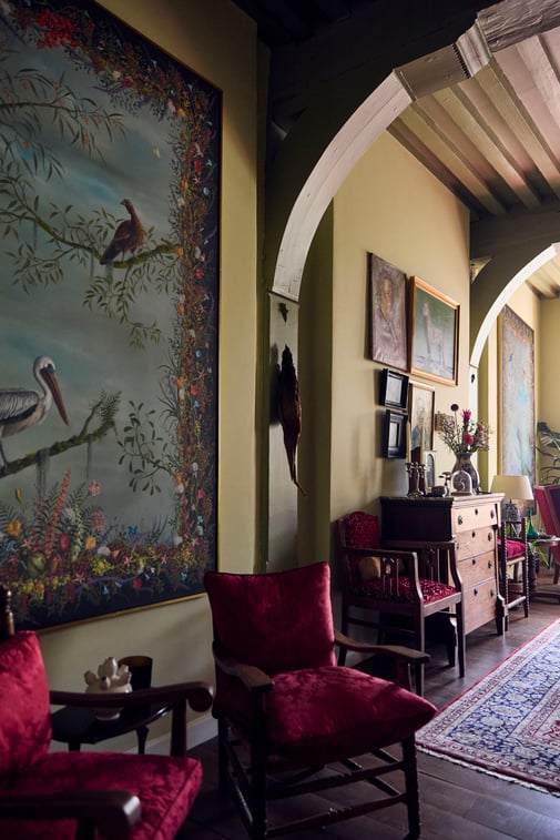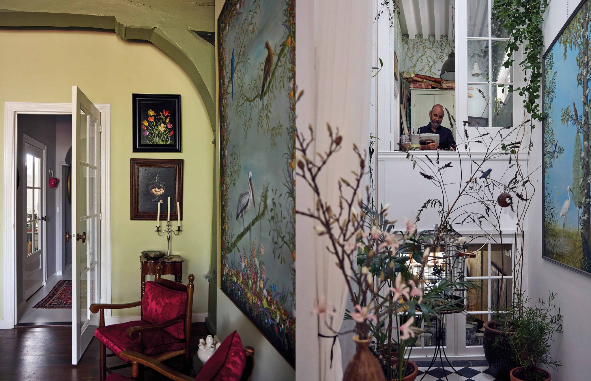 De laatste maanden hebben ze enkel aan een vierluik gewerkt, voor wat zij ‘de groene kamer’ noemen. Op de eerste verdieping aan de achterkant van het huis waren de balken en muren groen, dit hebben ze behouden, in een iets warmere tint. Zonlicht valt hier naar binnen op een frivole canapé in rood pluche, de ramen bieden zicht op een weelderige tuin. Tot in de puntjes vormgegeven is alles op elkaar afgestemd. De vier doeken met vogels omrand door bloemenguirlandes op een donkere achtergrond sluiten naadloos aan bij de inrichting, de stoffering en de sfeer van het vertrek. Hier is duidelijk te zien dat hun schilderingen een gesamtkunstwerk vormen met de rest van het interieur en het huis.