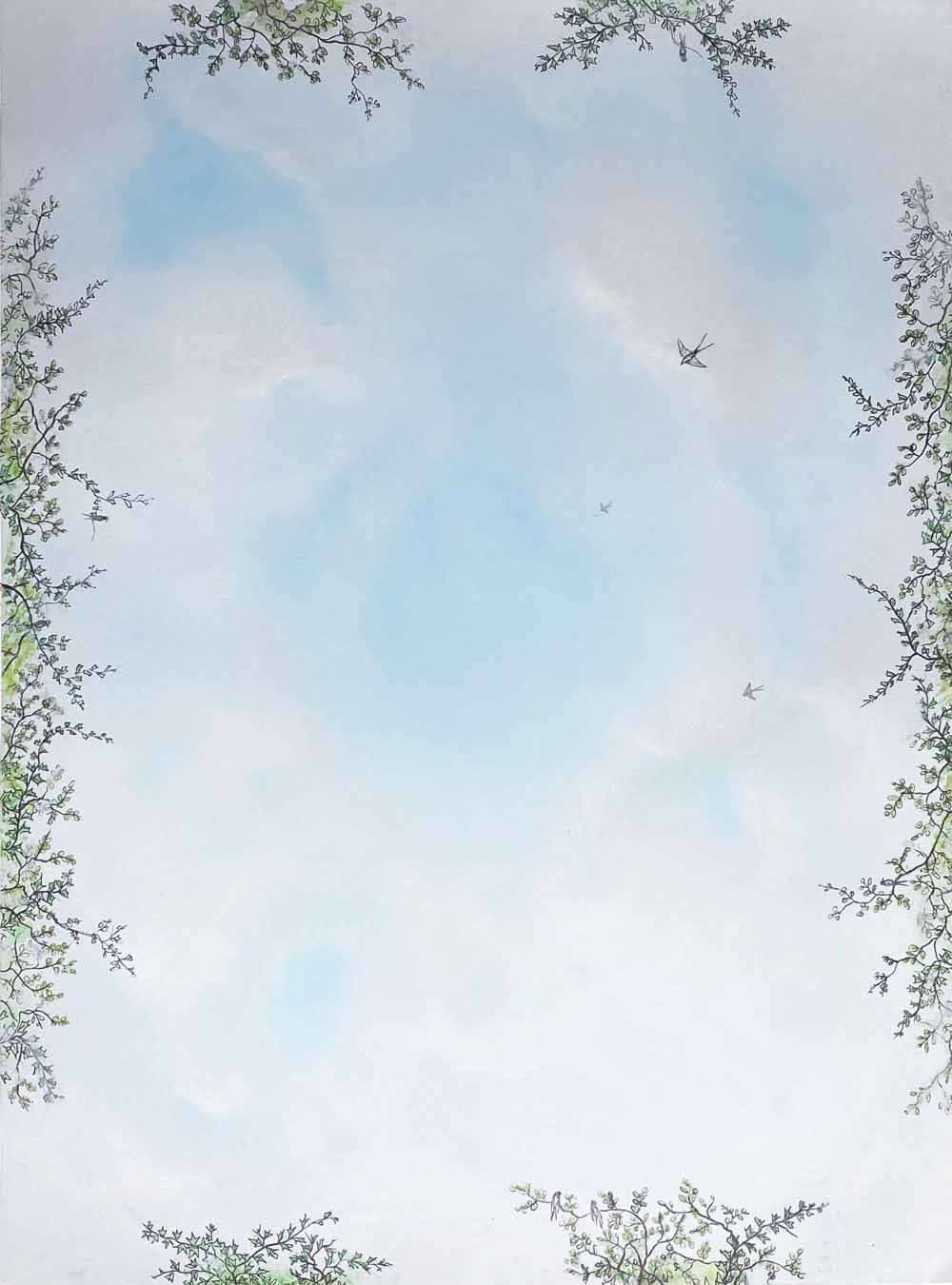 geschilderd volgens de lichtval van de Tuinkamer. Enkele zwaluwen zijn toegevoegd om het