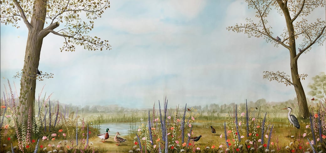 "Two ducks" Een behangschilderij van 400 x 195 cm. Sold
