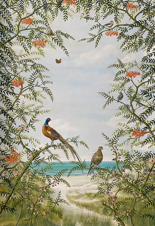 Sea side with Pheasants, +-110 x 180 cm, Emulsion paint and pigments on canvas. (Sold)