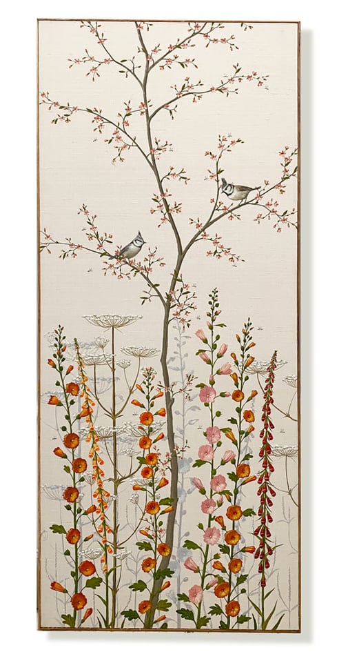 European crested Tits, 60 x 150 cm, Emulsion paint and pigments on Shantung Silk. verkocht