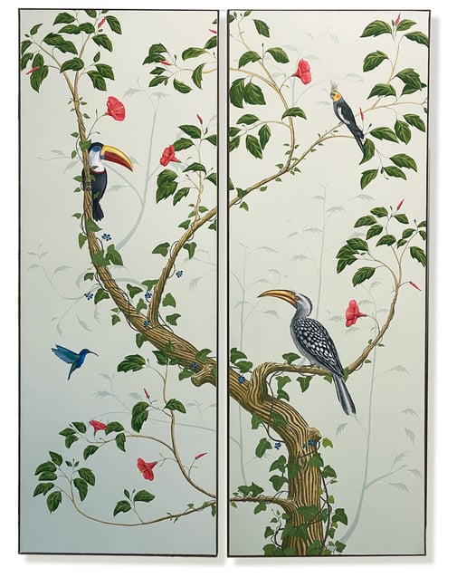 Een tweeluik met vogels 70 x 198 cm per paneel.