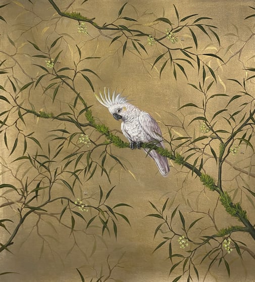 Cockatoo on 'golden' background 64 x 70 cm, Emulsion paint and pigments. (Sold)