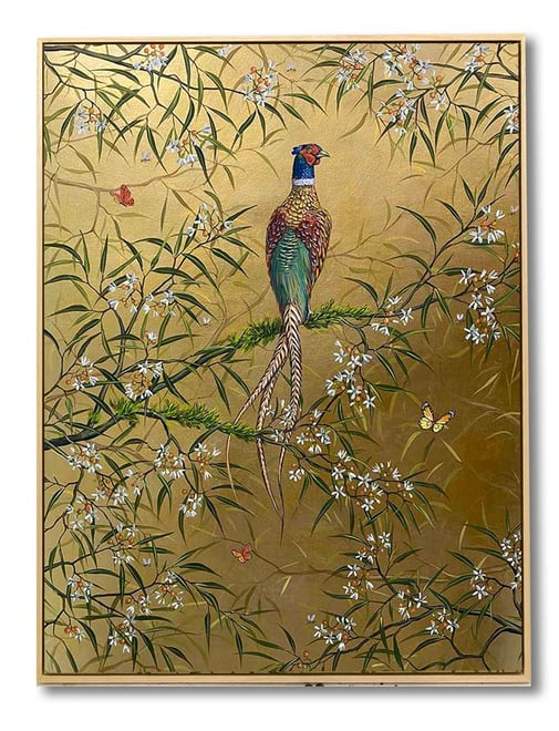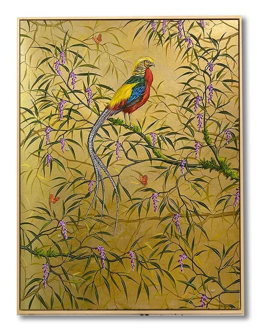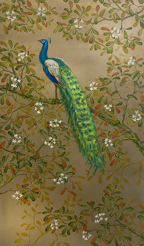 Peacock on golden background, 75 x 130 cm, Emulsion paint and pigments on paper. (sold)