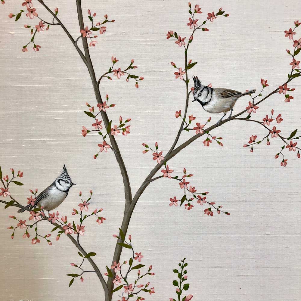 Emulsieverf op Shantung zijde, zilverkleurig.