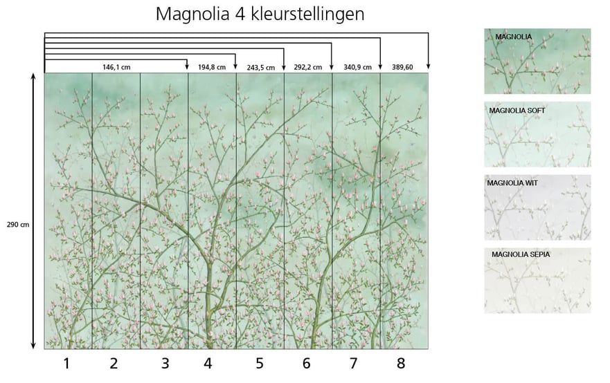 Dit ontwerp is opgebouwd uit 8 banen van 48,7 cm breed en 290 cm hoog. Minimale afname is 3 banen. Vraag hier gratis een staaltje van het behang.